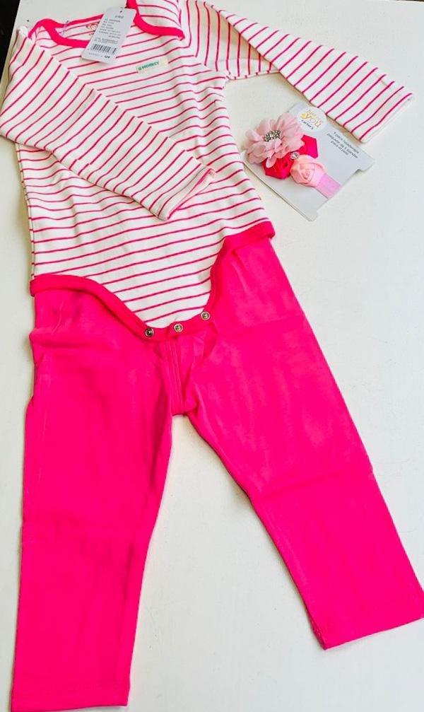 This outfit is a charming two-piece set for babies, featuring a long-sleeved bodysuit and matching trousers. 100% cotton