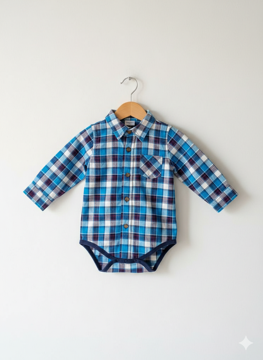 Design: A long-sleeve bodysuit featuring an allover blue and white plaid pattern.