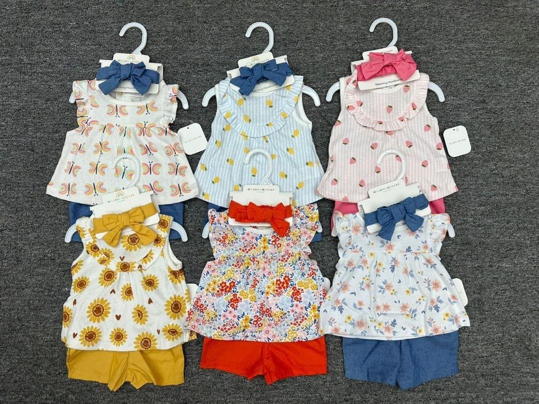 Baby girl's three-piece clothing set including a white sleeveless bodysuit, a pink floral dress, and matching pink floral bloomers.