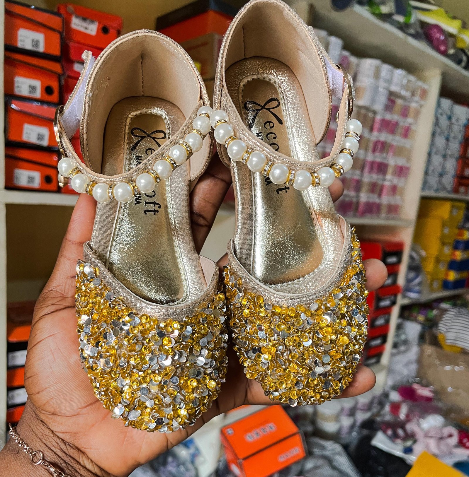 Gold sequin and faux pearl flat sandals